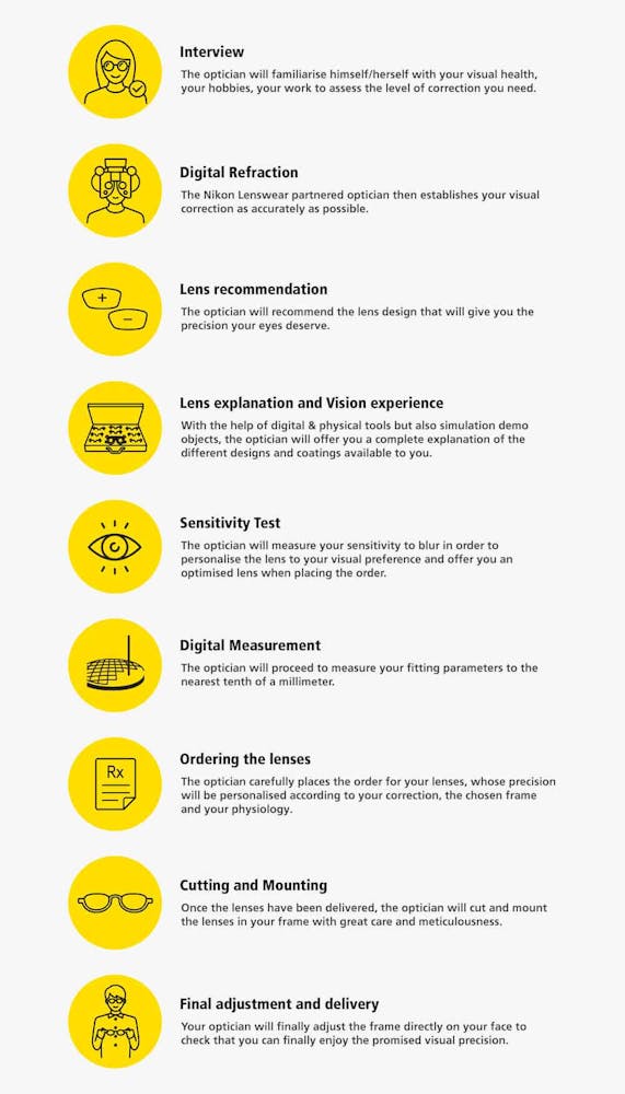 Here is the carefully thought out routine that Nikon Lenswear partnered opticians are encouraged to follow so as to help determine the best options available to you to heighten your visual acuity: