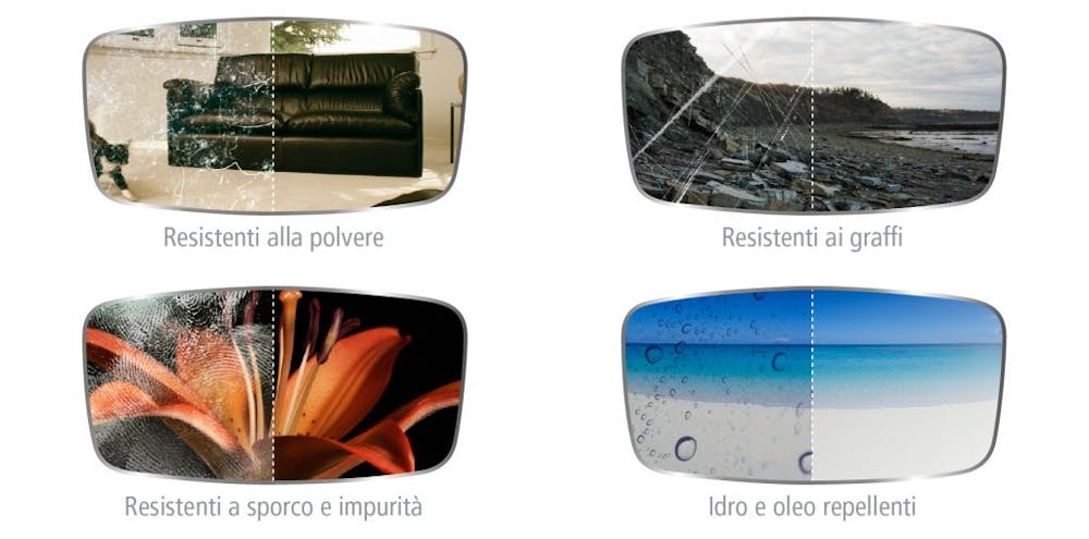 Tuttavia, le lenti trattate su entrambi i lati con un trattamento trasparente e resistente hanno una superficie molto più dura e, di conseguenza, più resistente ai graffi, sia nell'eventualità che gli occhiali cadano a terra sia durante l’occasionale pulizia con un panno di carta.