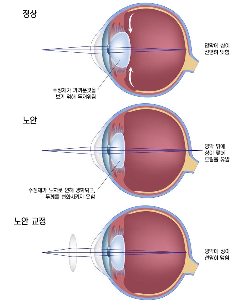 따라서 ‘노안’이라는 용어는 수정체의 유연성을 상실해 조절을 점점 어렵게 만드는 것을 말합니다.