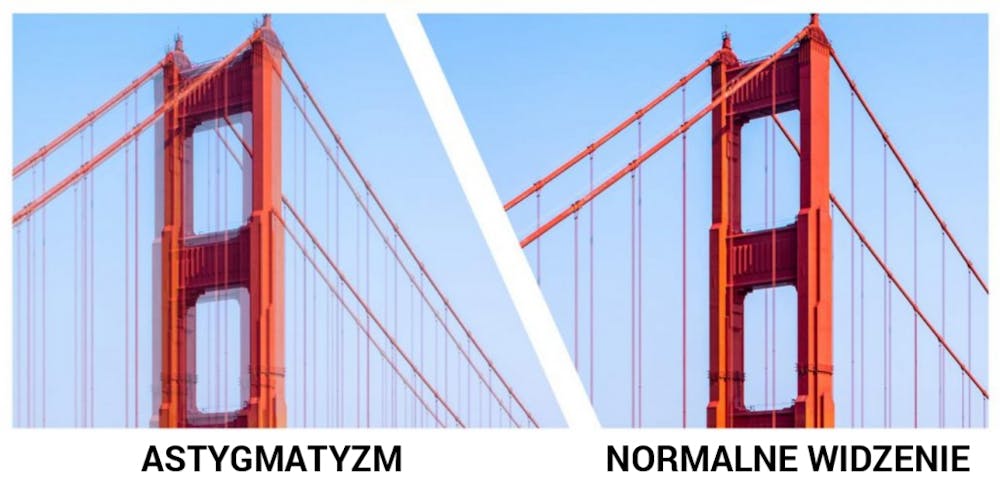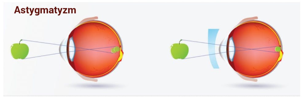 Nie jest to choroba oczu ani problem zdrowotny. Oko nie może równomiernie zogniskować światła na siatkówce, co prowadzi do rozmazanego lub zniekształconego widzenia. Upraszczając, astygmatyzm to nieprawidłowy sposób skupiania światła przez oko.