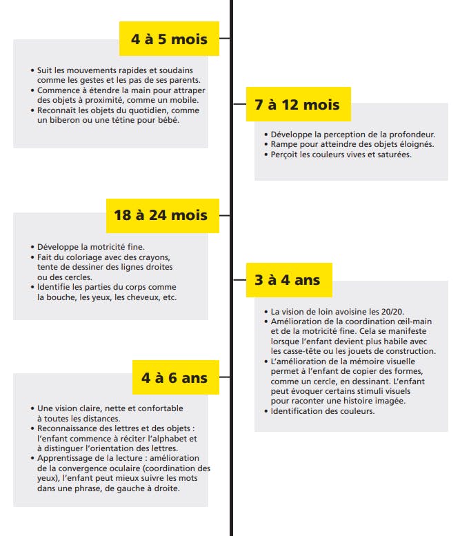 Voici une chronologie de base de certaines étapes clés du développement visuel d’un nourrisson, fondés sur l’âge. Mais n’oubliez pas que chaque enfant est unique et peut atteindre ces étapes à différents âges :