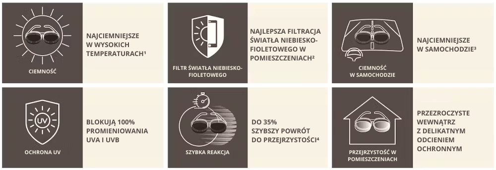 *Najciemniejsze w wysokich temperaturach i w samochodzie, blokujące 100% promieni UVA i UVB oraz oferujące najlepszą ogólną filtrację światła niebiesko-fioletowego we wszystkich warunkach oświetleniowych wśród przezroczystych do ekstra ciemnych soczewek fotochromowych. *Filtracja światła niebiesko-fioletowego (w zakresie od 400 do 455 nm ISO TR 20772:2018) wśród soczewek szarych z poliwęglanu i CR39 z premium powłoką antyrefleksyjną: filtracja (i) do 45% wewnątrz przy 23°C, (ii) do 64% za szybą, (iii) do 86% na zewnątrz przy 23°C oraz (iv) do 83% na zewnątrz przy 35°C.