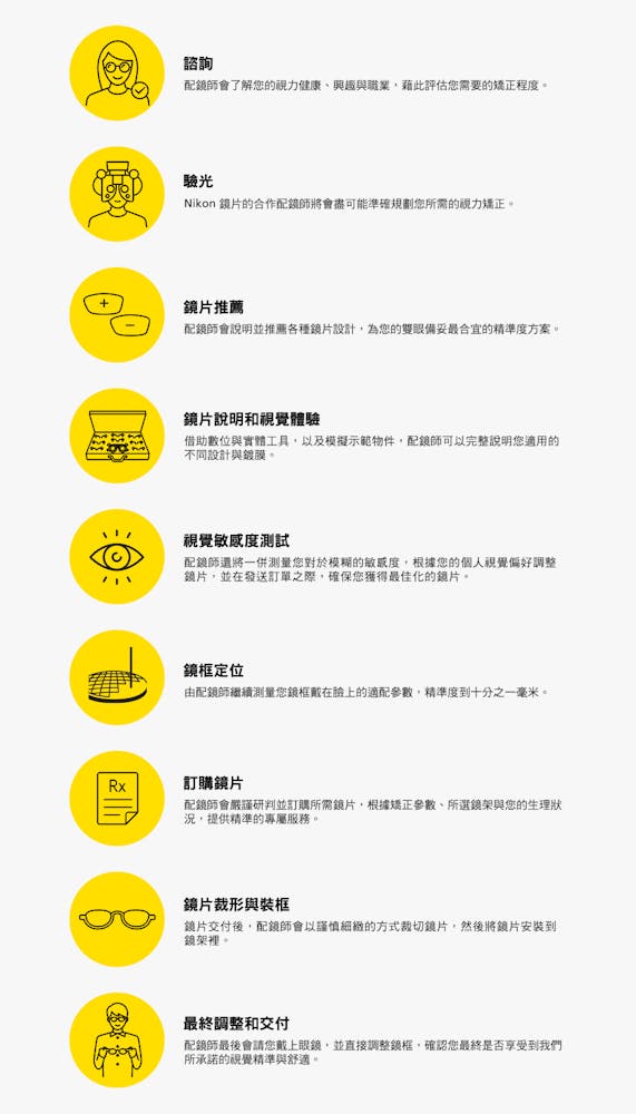 以下是精心規劃的例行流程,我們建議 Nikon 鏡片合作配鏡師遵循這樣的標準流程,協助您找出提升視力的最理想方案: